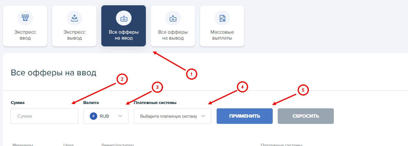 Кроме этого можно выбрать заявку из списка имеющихся на странице “Все офферы на ввод”, где следует указать сумму, валюту и платежную систему. Процесс покупки точно также, как и при использовании экспресс ввода.