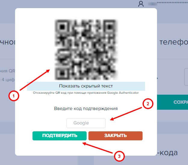 Откроется окно, где нужно отсканировать QR-код через приложение Google Authenticator с помощью камеры телефона. Затем введите код подтверждения, который высветится на экране смартфона – появится в последнем добавленном аккаунте приложения Matbea.com. После ввода нажмите на зеленую кнопку «Подтвердить».