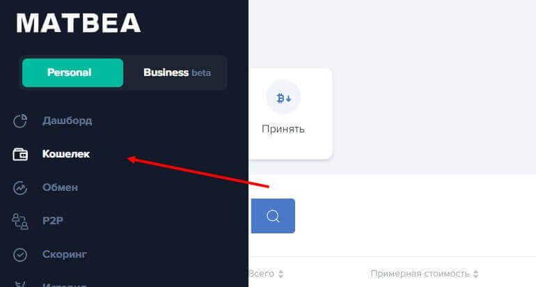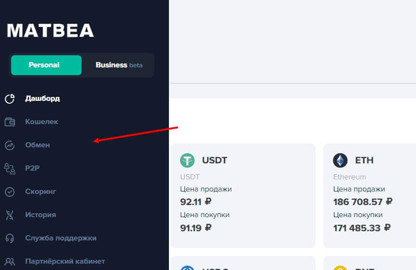 Также клиенты могут провести обмен средств на MatBea. Для этого в боковом меню следует открыть раздел “Обмен”.