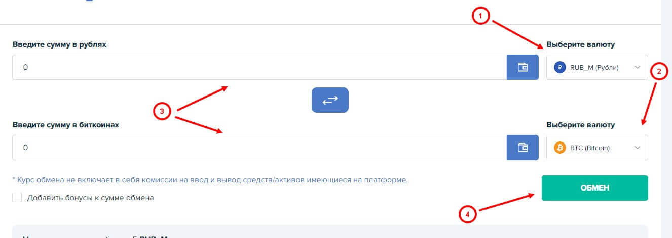 Затем нужно выбрать валюту, которую отдаете и получаете по внутреннему курсу сервиса. Укажите сумму в одном из полей, например, сколько готовы отдать и в другом автоматически рассчитается сумма к получению в другой валюте. Затем нажмите на кнопку “Обмен” и на вашем счету появится средства в разделе “Кошелек”.