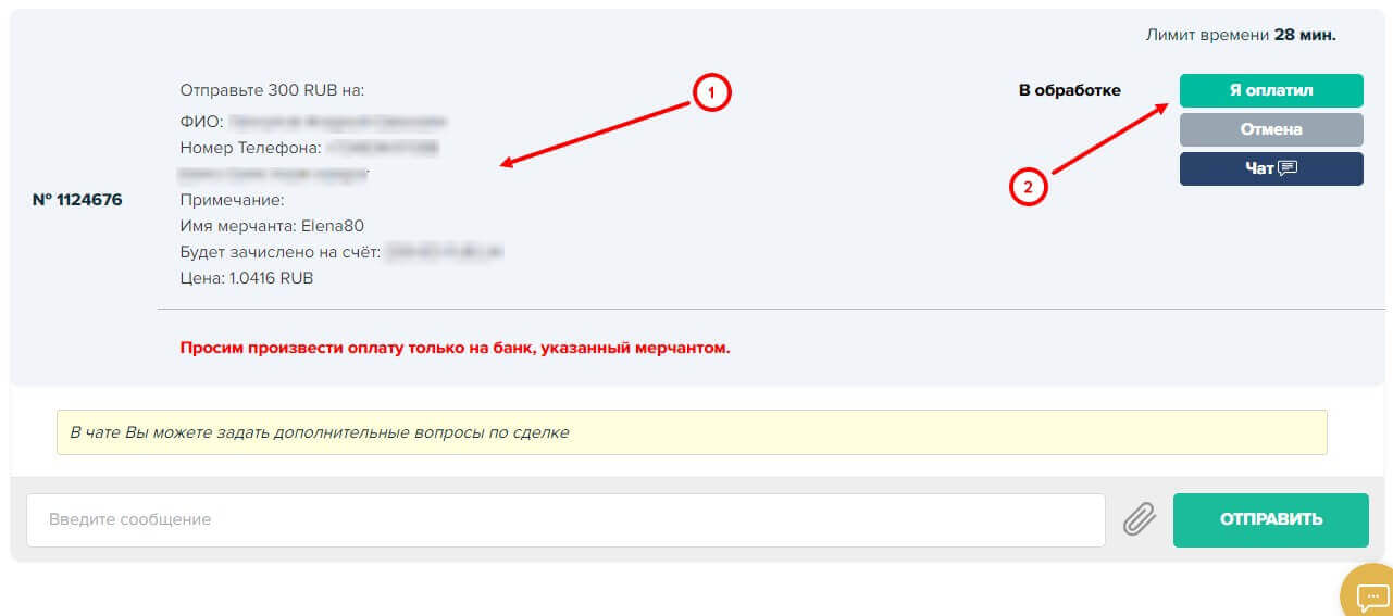 Затем откроется страница, где появится информация о заявке, куда нужно будет перевести средства и сколько зачислиться на кошелек. Переведите средства и нажмите на кнопку “Я оплатил”. В случае появления вопросов, ниже имеется чат, где можно задать вопросы по сделке и прочим моментам.