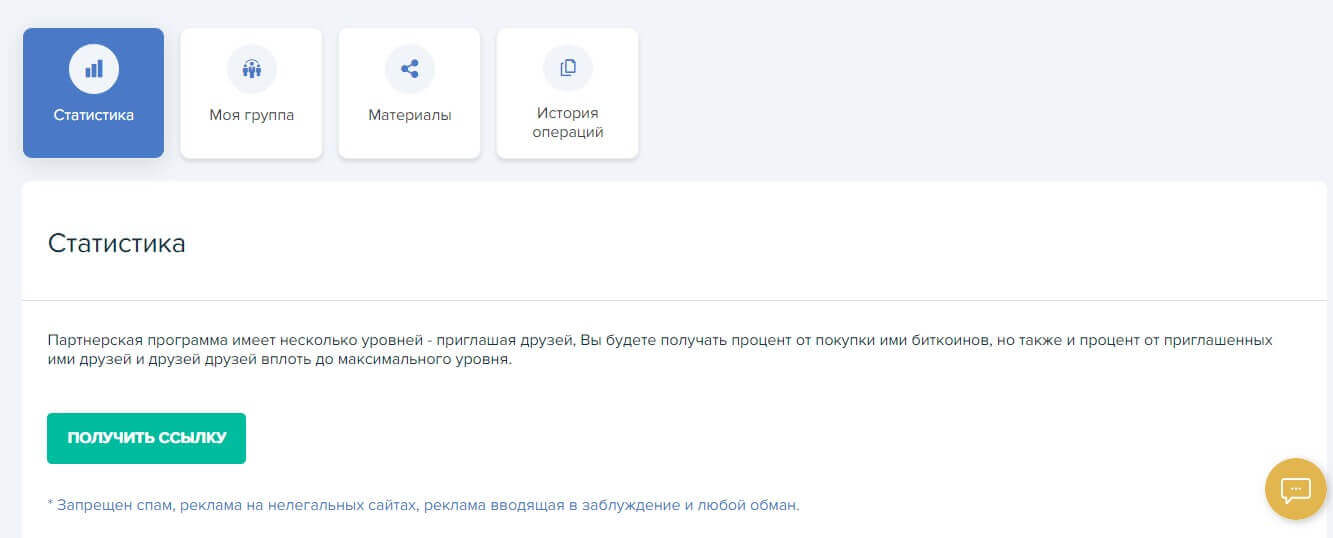 На странице “Партнерский кабинет” можно найти ссылки, статистику о привлеченных клиентах и суммы заработка, группа клиентов, материалы для установки баннеров на собственный сайт и история операций. Количество приглашенных пользователей не ограничено, а награды поступают напрямую на личный счет на биткоин кошелек, откуда можно вывести с помощью P2P-сделки.