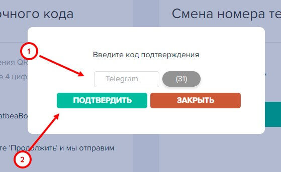 Появится форма, где нужно будет указать код, который придет к вам в мессенджер телеграмм и нажмите на кнопку “Подтвердить”.