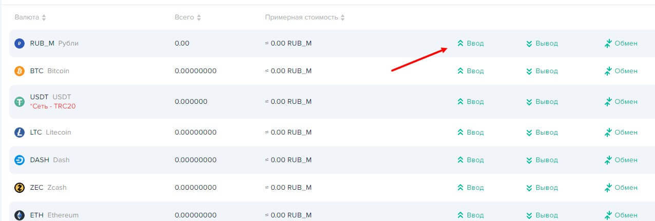 Чтобы произвести пополнение кошелька, нужно перейти в раздел “кошелек” и нажать на кнопку “Ввод”, рядом с необходимой криптовалютой. После этого выполните инструкцию – находится в нашем обзоре: выберите способ или продавца (мерчанта) и оплатите заявку.