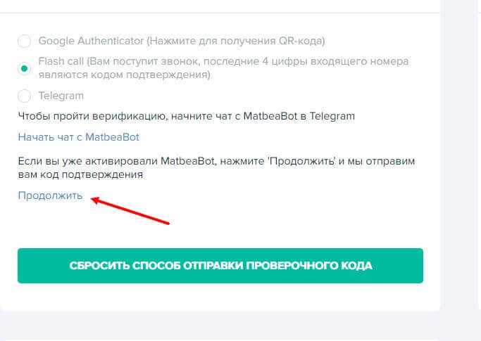 После отправки номера, вернитесь в интерфейс сервиса Matbea и нажмите на пункт “Продолжить”.
