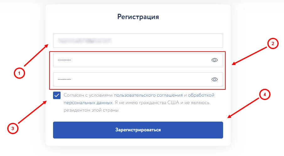 В открывшейся форме нужно указать номер собственного телефона или адрес электронной почты и пароль (с его повторением). После этого следует нажать на кнопку, где нужно согласиться с условием пользовательского соглашения, а также то, что клиент не имеет гражданства США и не считается резидентом страны. Прочитать положения можно нажав на ссылки, подсвеченные синим цветом. Перепроверьте данные и нажмите на кнопку “Зарегистрироваться”.