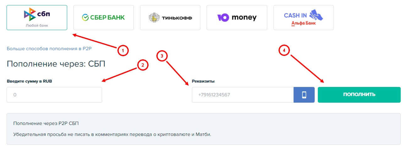 Затем нужно выбрать метод экспресс ввода, выбрав один из способов для пополнения счета. В случае с рублевым счетом можно пополнить через СБП, СберБанк, Тинькофф, Юmoney и АльфаБанк. Выбираем, например, СБП, вводим сумму и реквизиты, с которого будет проведен платеж — в нашем случае номер телефона. После этого нажмите на кнопку пополнить.