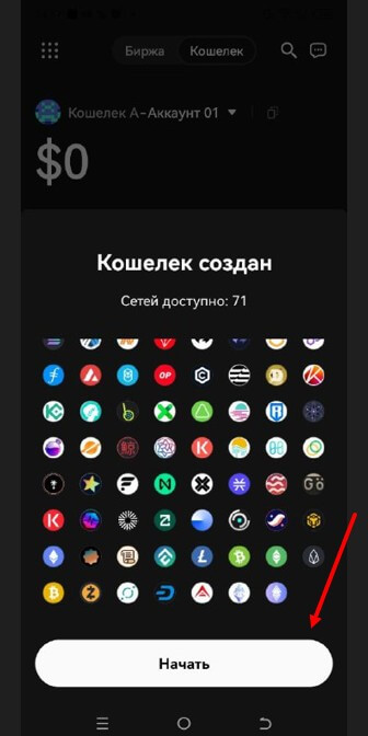Затем появится сообщением о том, что кошелек был создан, также будет перечислен список доступных сетей в количестве 71 штуки. Нажмите на кнопку “Начать”, чтобы продолжить.