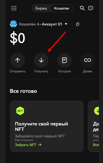 - Нажмите в главном меню кошелька кнопку “Получить”;