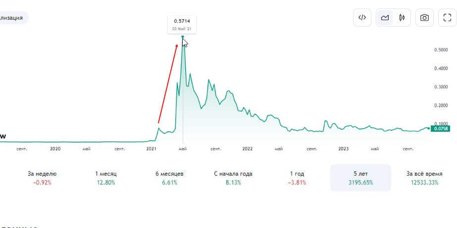 Затем, как показывает график Tradingview в мае зафиксировалась историческая отметка в 0,5714 долларов. Тем самым цена монеты выросла за 4 месяца в 63 раза.