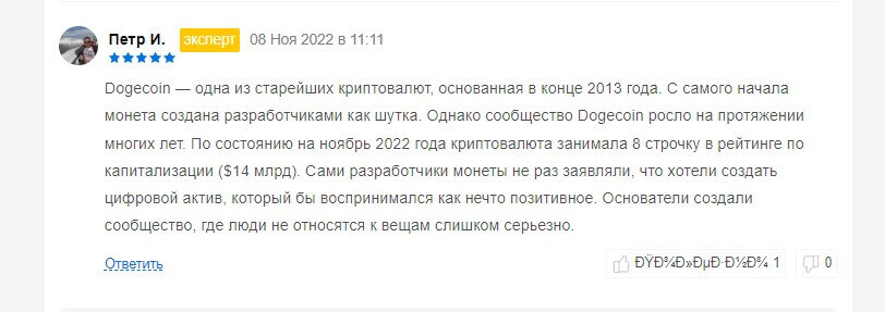 Некоторые пользователи считают то, что монета является несерьезной, но есть и свято верующие, что она перевернет весь мир, хотя она сделана как пародия на реальные проекты, обладающие своими целями и задачами. Вот один из отзывов, в котором пользователь говорит, что она является перспективной.