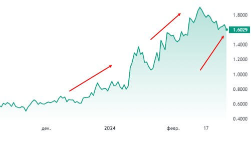 Преодолеть порог в 0,70 доллара за монету удалось только лишь в конце декабря, когда цена выросла сначала до 0,77 за монету, а затем в начале 2024 года монета преодолела порог в 1 доллар. Максимальный пик в стоимость оказался 1,8 доллара 12 февраля 2024 года. Сейчас (конец февраля) курс варьируется в промежутке 1,6 – 1,7 долларов за монету.