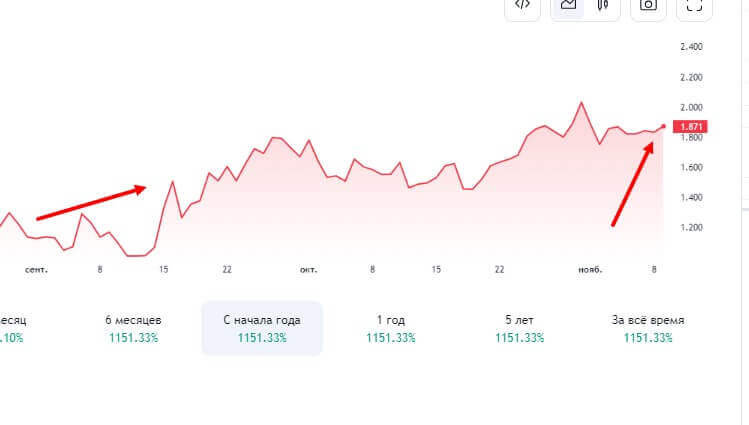 Начало торгов по монете началась с 24 июля нынешнего года, когда она стоила порядка 2,16$ и уже с первых дней начала свой рост вплоть до 2,43$ за монету, показав прирост за неделю на 12,5%, как это показано на графике tradingview. Однако уже сразу же началось стремительное понижение стоимости и к 17 августу зафиксировалась по курсу в 1,37$ за монету, что составило падение в 43,4%. Минимальная цена, достигнутая за весь период составляла 1,09 доллара 11 сентября.