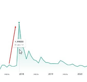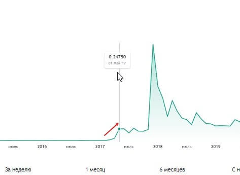 Резкий рост был спровоцирован падением и последующей коррекцией на протяжении полугода. Разумеется мы говорим про период с 1 ноября по 1 декабря 2017 года, когда цена выросла с 24 центов до своего пикового на данный момент значения – 1,99 доллара, тем самым рост составил x8. Также увеличилась и капитализация с 9 до 77 млрд. долларов.