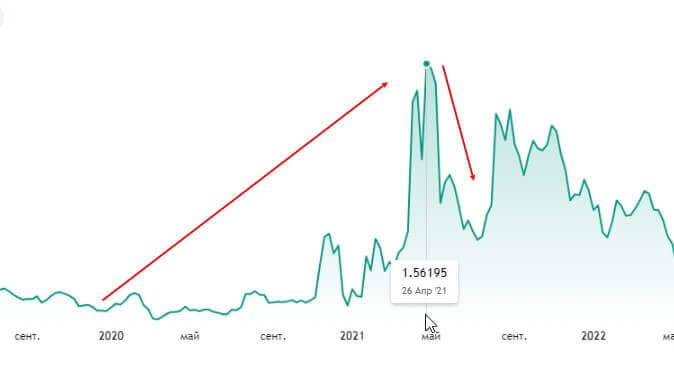 После ошеломительного роста цена начала падать и следующий рост и переход на бычий рынок произошел в период с декабря 2020 по апрель 2021 года, когда цена поднялась с 19 центов до 1,56 долларов, снова показав рост в 8 раз. Но следом последовал медвежий рынок, который часто сменивается бычьим на пару месяцев, с последующей корректировкой стоимости.