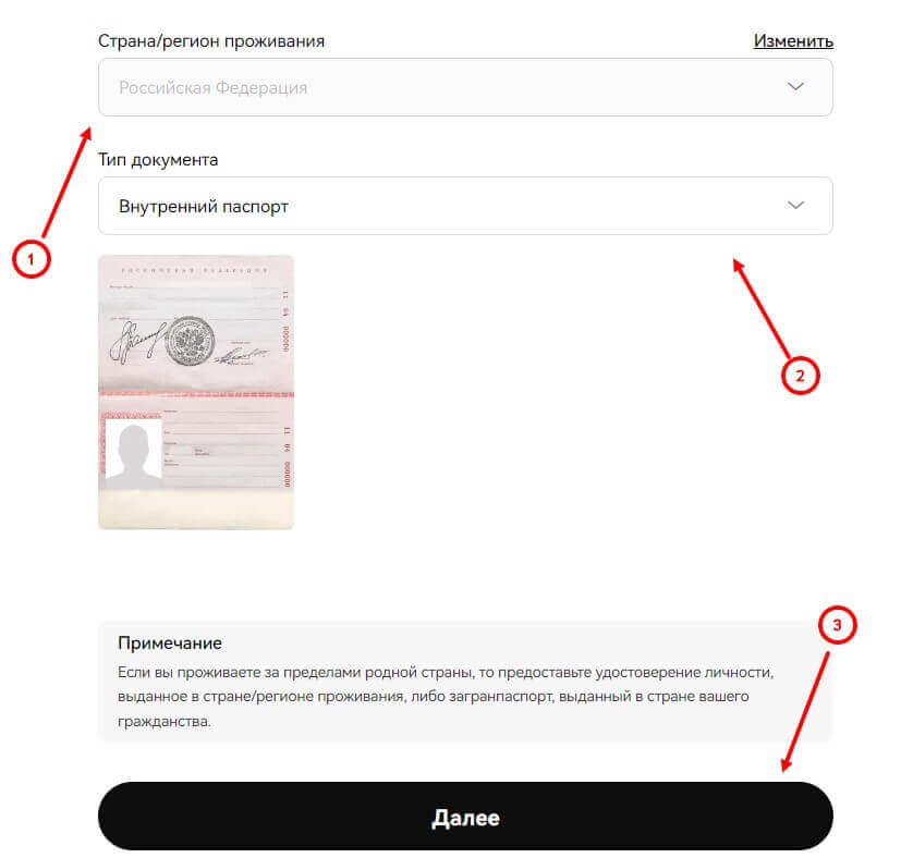 - Выбрать страну/регион проживания, выбрать тип документа (паспорт, водительские права или загранпаспорт).