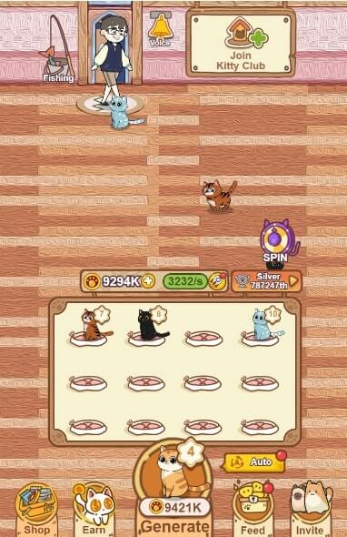 — имея в запасе некоторое количество монет, можно добавлять на игровое поле новых котиков определенного уровня (в зависимости от имеющихся достижений).
