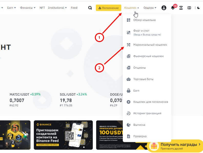 - Перейдите в раздел “Кошелек” – “Маржинальный кошелек”. Нажмите на последний пункт, который появился в раскрывающемся меню.