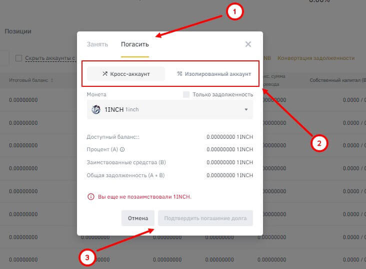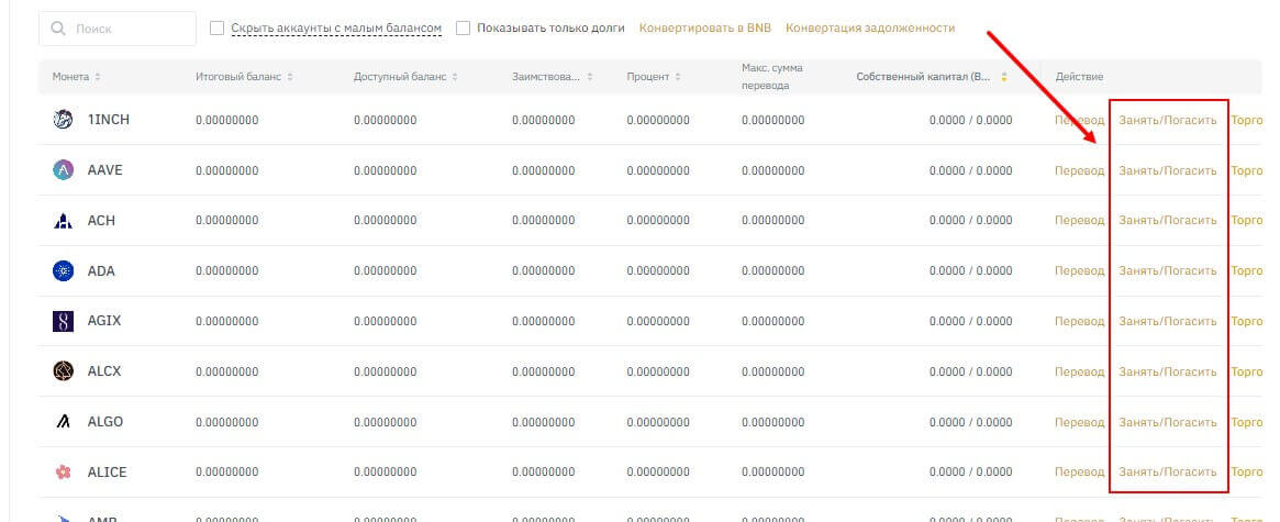 - Затем выбираем именно ту монету, которую необходимо погасить для закрытия криптовалютного долга. Для этого пользователю следует кликнуть по кнопке “Занять/Погасить”.