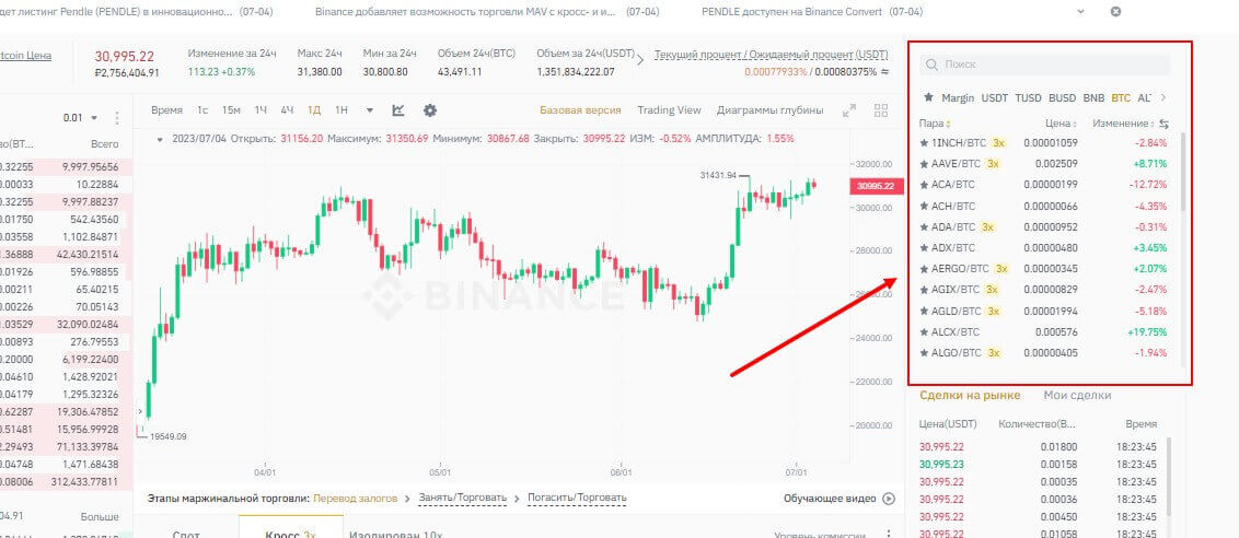 Для торговли с помощью маржи, которая предлагается криптовалютной биржей Бинанс, следует сделать следующие нижеописанные шаги. В качестве примера была взята самая популярная валютная пара BTC/USDT.