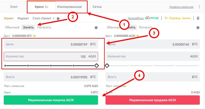 Затем ниже выбираете вид маржи “Кросс” или “Изолированная”. Стандартно будет выбрана “Кросс”. После этого выбираете пункт “Занять”, вводите сумму биткоина, а также количество другого приобретаемого актива. Ниже будет написана расчетная комиссия и сколько криптовалюты будет занято у биржи. После этого нажимаете на “Маржинальная покупка”.
