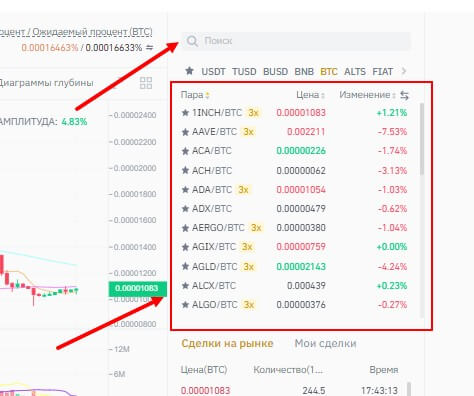 Выберите пару активов, доступных для торговли. Находится список в верхней левой части страницы. Можно выбрать из наиболее популярных или же воспользоваться поиском введя одну из криптовалют, фигурирующая в вашей будущей сделке.