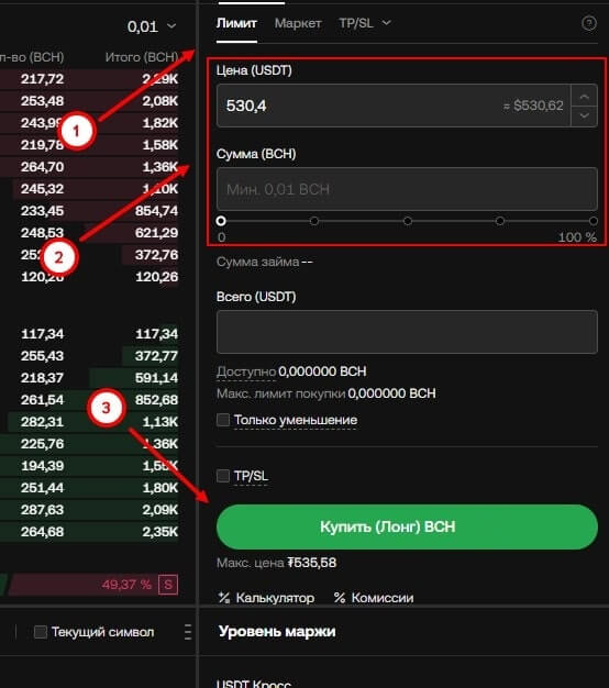 - После этого нужно стандартно как в обычной спотовой торговле: выбрать тип ордера (лимит или маркет), указать сумму покупаемой или продаваемой криптовалюты, их количество. Затем кликнуть на кнопку “Купить (в лонг) BCH” или “Продать (в шорт) BCH”.