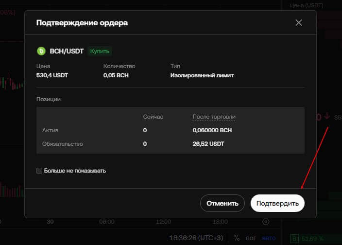 - После этого появится окно для подтверждения операции. Перепроверяем указанную ранее информацию и нажимаем на кнопку “Подтвердить”. После этого ордер будет исполнен или встанет на ожидание (исполнение произойдёт после достижения криптовалюты необходимой стоимости).