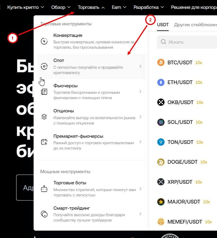 - Найти в верхнем меню и перейти в раздел “Торговать” – “Спот”.