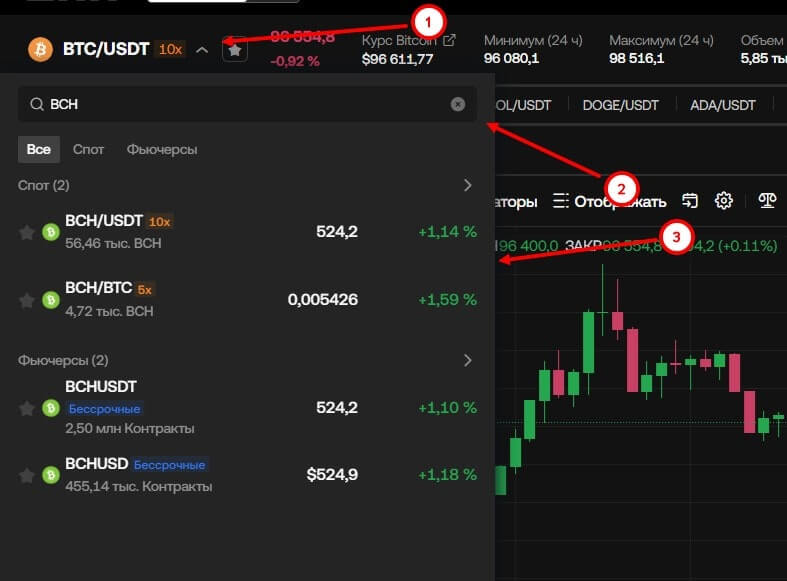 - Выбрать криптовалютную пару (важно учесть то, что не для всех активов доступна маржинальная торговля, доступная маржа указана рядом с активом, например, 10x, тем самым можно воспользоваться от 1x до 10x).