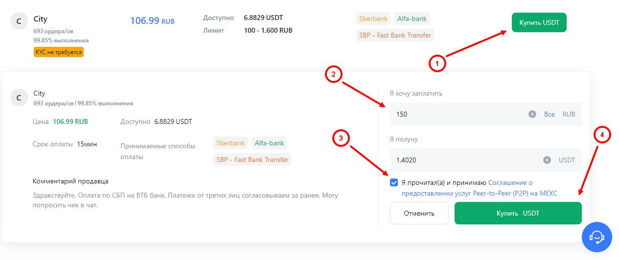 В появившемся списке следует выбрать варианты для покупки, и в нашем случае имеется лишь один подходящий. Также нажмите на кнопку “Купить USDT”, если планируете купить Tether USD и укажите сумму, которую планируете заплатить, и ниже появится количество получаемого цифрового актива. Подтверждаете соглашение о предоставлении услуг Peer-to-Peer (P2P) на MEXC и нажимаете на кнопку “Купить USDT”.