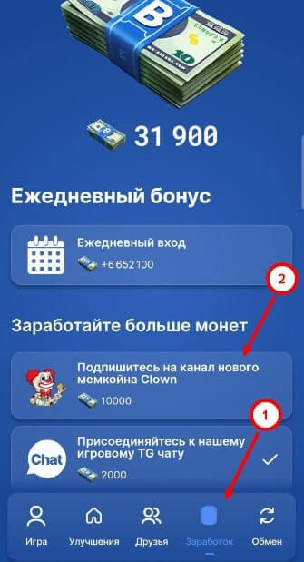 Кроме улучшений имеются два дополнительных способов заработка “босскойнов” – платные задания и реферальная программа.