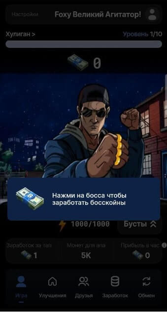 После этого появится интерфейс игры. Первое, что нужно сделать, пройти обучение, где будет рассказана суть игры. Затем необходимо кликнуть на босса мафии, чтобы начать зарабатывать некие “босскойны”. Чем больше кликов будет совершено, тем больше “босскоины” будут получены.