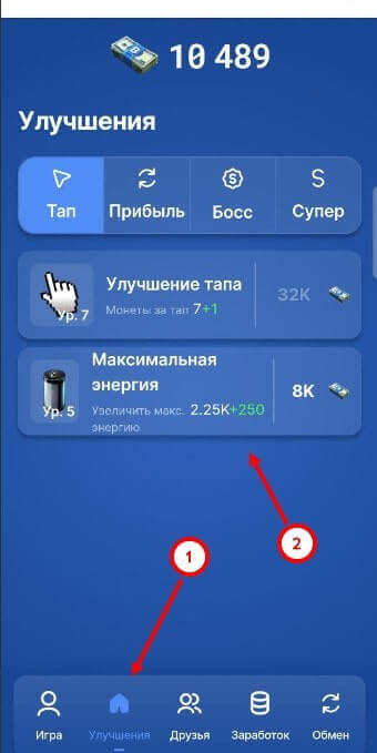 Первый улучшает эффективность тапов. Улучшение тапа позволяет получать больше монеток за ТАП и увеличения количества энергии за раз. Остальные улучшения позволяют увеличить пассивный заработок в час, не зависимый от тапов.