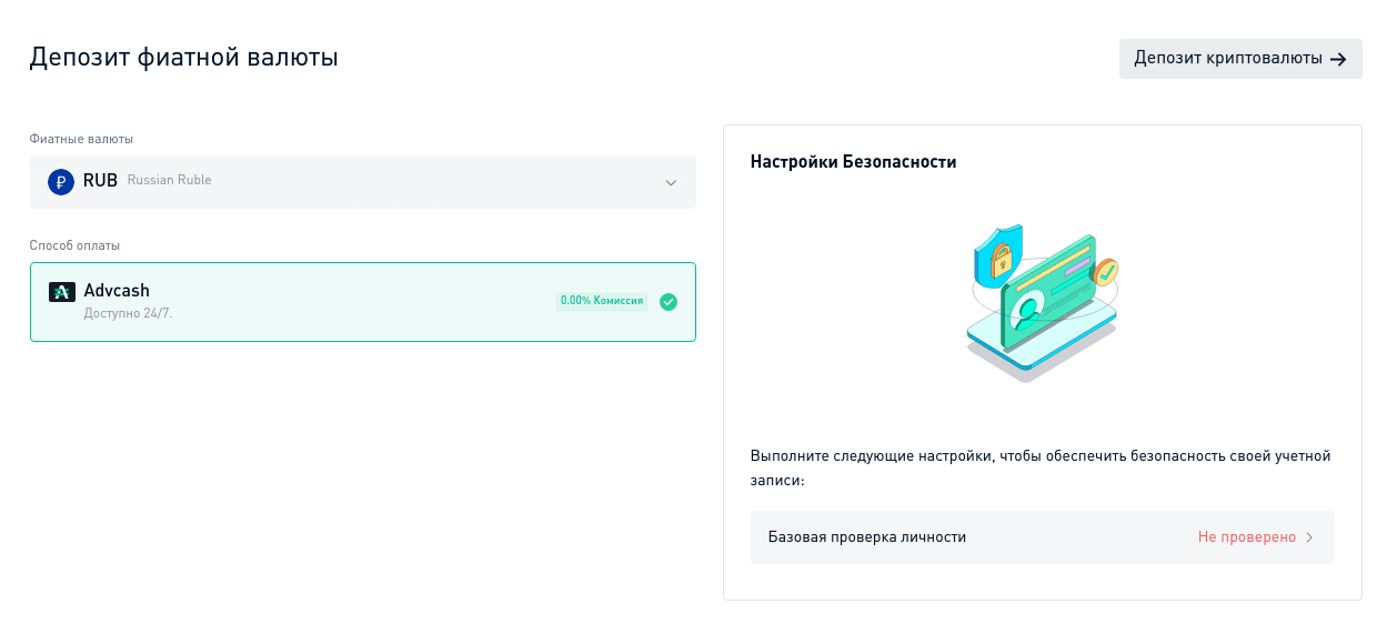- Пополнение баланса банковским переводом. Способ не отличается оперативностью, но становится доступен тем, кто не может применять ни один из озвученных ранее каналов. Для сделок в российских рублях используется система AdvCash. Подобным образом можно производить только фиатный депозит, а впоследствии за счет конвертации получать требуемую криптовалюту.