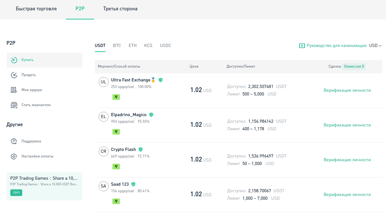 - Обмен фиата на криптовалюту здесь происходит напрямую между участниками. Владельцы аккаунтов могут выбирать из 5 видов токенов и множества способов финансирования проводимых транзакций. Как видно из приведенного далее скриншота, без подтвержденного аккаунта проведение сделок недоступно. Рядовые пользователи могут и сами становиться мерчантами, выставляя свои собственные предложения на покупку и продажу.