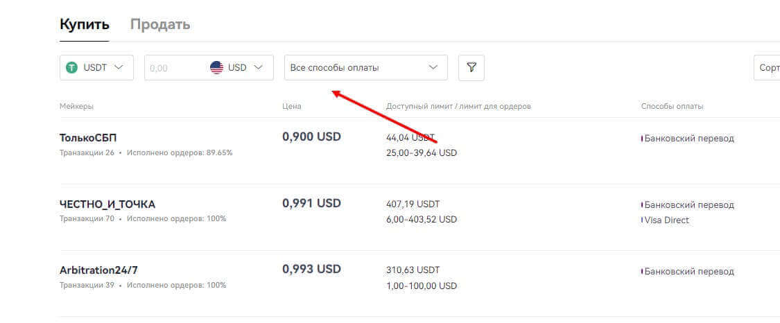 - Выберите необходимую вам валюту. Платформа предлагает широкий выбор фиатных и криптовалют и гибкие фильтры для поиска, например, способ оплаты (на Сбербанк, Тинькофф или другие варианты) подходящего предложения, включая способы оплаты, валюту и ценовой диапазон.