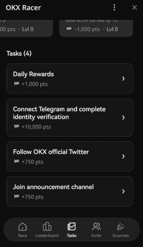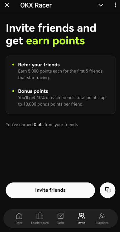 Участие в реферальной программе открывает возможность зарабатывать экстра баллы. Через программу OKX Racer, за первых несколько друзей, присоединившихся к игре, вы будете вознаграждены 5000 очков за каждого. К тому же, 10% от общего количества очков, заработанных вашими рефералами, перейдут к вам, но сумма бонуса не превысит 10 000 очков за одного приглашенного.