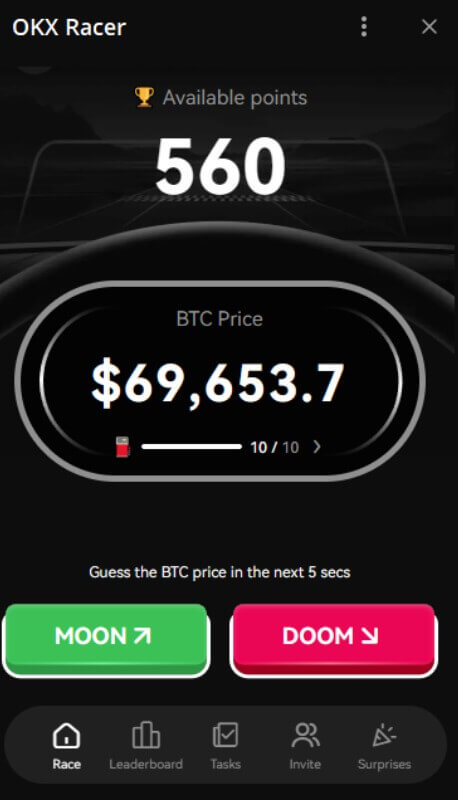 Суть игры OKX Racer заключается в предсказаниях будущего курса биткоина. Используя кнопки Moon (если предполагаете то что курс будет идти вверх) или Doom (если ожидаете падение), игроки стараются угадать направление движения курса в последующие 5 секунд.