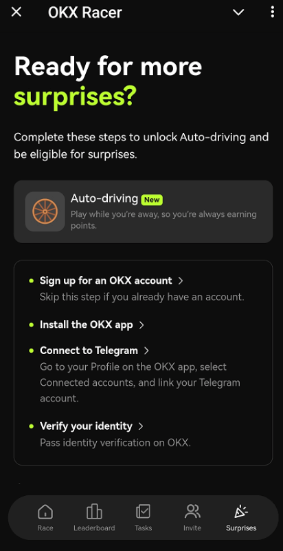 Объявлено, что пользователи OKX Racer в скором времени могут ожидать целый ряд уникальных предложений и бонусов, включая аирдропы. В числе первых представленных возможностей выделяется функция Auto-driving, предлагающая генерацию пассивного дохода даже при отсутствии в сети. Чтобы активировать эти возможности, крайне важно синхронизировать ваш игровой аккаунт с аккаунтом на бирже OKX, следуя нижеописанным шагам: