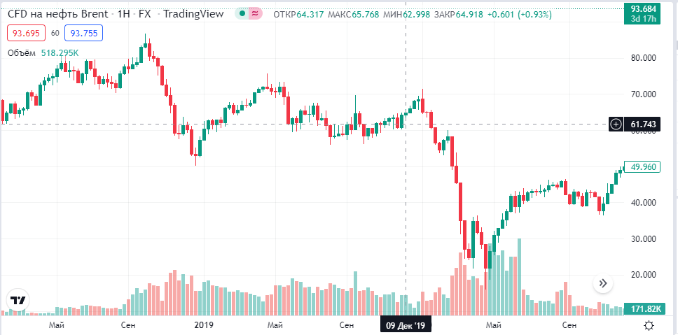 Это недельный график нефти. В 2019 Саудовская Аравия значительно нарастила объем добычи ископаемых углеводородов, в результате чего предложение увеличилось, а спрос на мировом рынке остался прежним. Это привело к существенному падению цен на энергоносители. В конце апреля 2019 нефть марки Brent торговалась на бирже ниже 20 долларов за баррель, что в 2 раза дешевле сланцевого газа. В результате добыча альтернативного топлива (сланцевый газ, к примеру) стала нерентабельной. Весной 2019 состоялось экстренное заседание ОПЕК+, на котором было принято решение о постепенном сокращении объемов добычи нефти для стабилизации цен. Это и стало основной причиной формирования восходящего тренда.