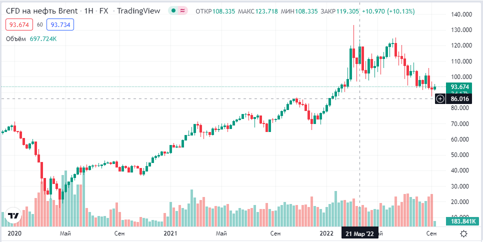 В результате стоимость нефти возросла с 20 до 120 долларов за баррель. Что произошло? Сокращение добычи (снижение предложения) и стабильно высокий спрос.