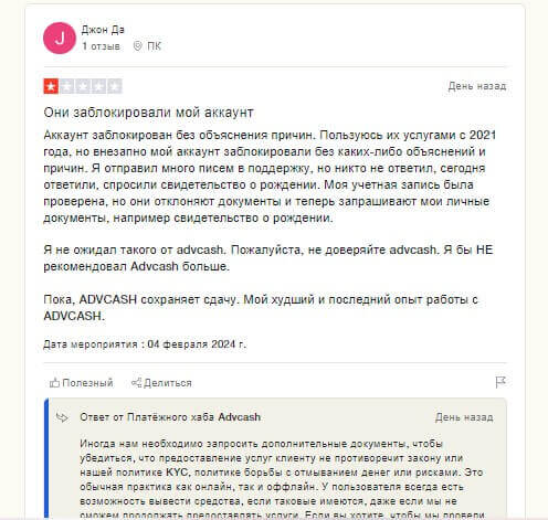 Однако следующий отзыв Advcash напрочь заставляет думать многих людей, что сайт блокирует счета. Джон из своего отзыва выделил то, что счет был заблокирован без объяснения причин. При отправке писем в техническую поддержку на вопросы никто не ответил. Однако на TrustPilot компания дала обратную связь, извинившись перед клиентом и рассказав о том, что действовали согласно инструкции. Следует сказать о том, что клиент не рассказал суть, почему заблокировали, ведь он реально мог нарушить политику KYC и AML.