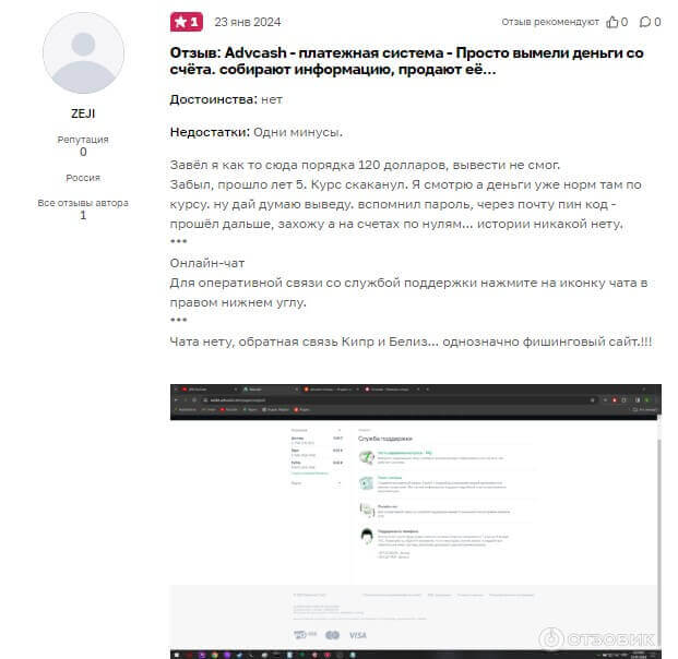 Важным моментом считаются отзывы о данной платежной системе, предоставляющая большой вариант продуктов для клиентов. В первом из попавшихся отзыве, клиент пишет о том, что несколько лет назад завел на счет 120 долларов и забыл про него. Вспомнив, он восстановил доступ к сервису и обнаружил, что его денег на счету не оказалось. Также он заявил, что это фишинговый сайт, хотя на показанном скрине открыт официальный сайт.