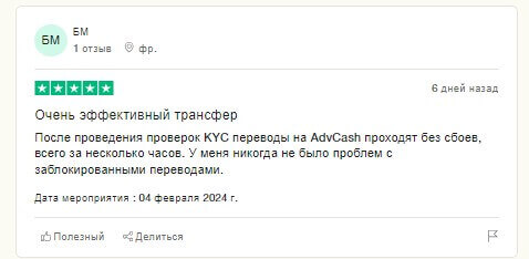 В другом отзыве клиент заявляет о том, что после прохождения KYC на официальном сайте переводы проходят без сбоев и он доволен работать с данной платежной системой. Также поделился об отсутствии ситуаций, связанных с блокировками счета и переводов и ставит сервису 5 звезд из 5.