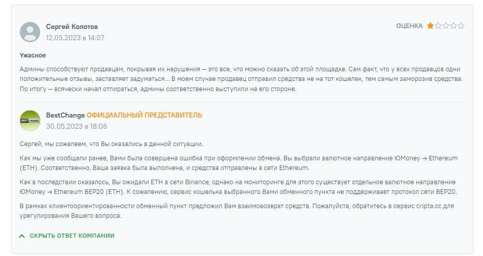 Также один из клиентов написал о том, что “площадка полностью аффилирована с мошенниками”. По его словам, компания представлялась как независимый сервис, однако не соответствует этому из-за блокировки по добавлению негативного отзыва в сторону любого из обменных пунктов. Также заявил о неадекватности технической службы поддержки.