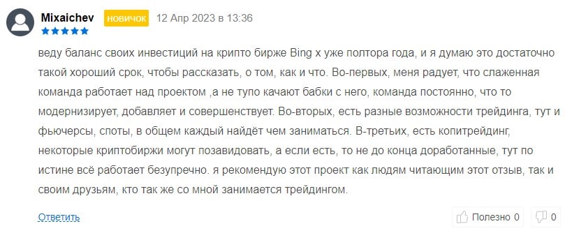 В другом отзыве о Bingx пользователь из Ирана рассказал о том, что это инновационная биржа, которая предоставляет качественные продукты, обладающие высоким качеством, в т.ч. они поддерживают копи-трейдинг и криптовалюты. Также он сказал и о том, что компания может предоставить лучшую техническую поддержку. В целом он рекомендует доверять бирже и пользоваться ею для проведения торговых операций.