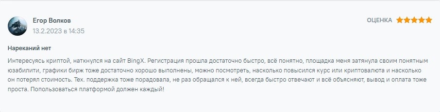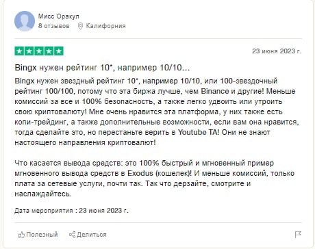 Еще один отзыв Bingx, о котором хотели рассказать оставил пользователь из Калифорнии, США. Он рассказал о том, что рейтинг 5/5 для компании слишком маленький и им нужно поставить 10/10. Рассказал о безопасности платформы, а также возможности увеличить сумму криптовалюты в несколько раз. Также он отметил и то, что вывод криптовалюты или фиата на сайте торговой платформы работает на все 100% и происходит мгновенно.