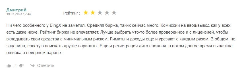 Тем самым торговая площадка Bingx имеет среднюю оценку равную 2,8 звезды, что не так плохо, однако учитывая сколько положительных оценок получил сервис, то можно сказать о качестве его предоставляемых услуг на рынке криптовалют и инвестиций в цифровые продукты.