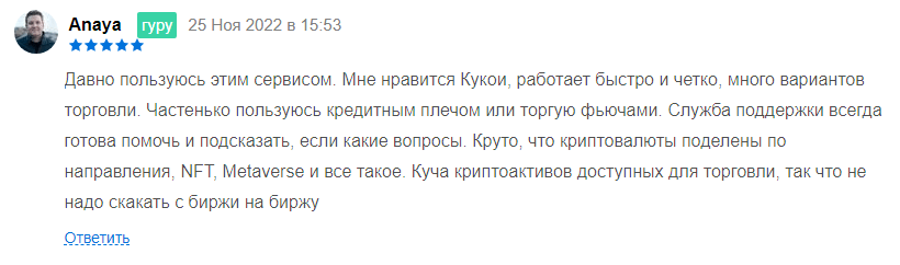 Рассмотрев наиболее информативные отзывы Kucoin, эту площадку можно смело рекомендовать широкому кругу пользователей криптовалютных активов самых разных видов биржевой активности. А наличие всех вариантов получения профита, от активных торговых до инвестиционных и депозитных, делает Kucoin универсальной площадкой.